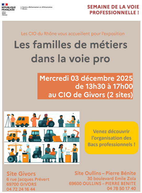 Dans le cadre de la semaine des lycées professionnels (du 1 au 5 décembre 2025), les Centres d’Information et d’Orientation du Rhône organisent une exposition afin d’informer sur les Familles de Métiers dans la voie professionnelle.